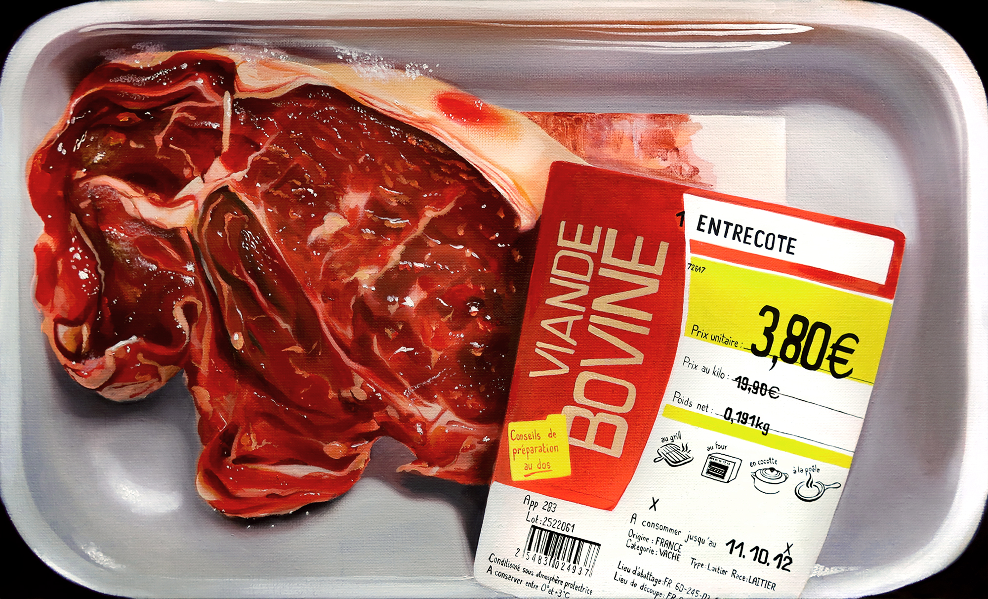 Considérer l'objet «morceau de viande» tel qu’il est massivement proposé aujourd’hui à la vente, sans y insuffler de jugement sur des enjeux sociétaux actuels et hors des codes de la vanité.